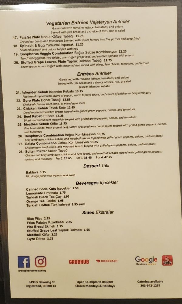 Introducing Bosphorus - a Mediterranean-Middle Eastern restaurant located in Englewood, CO. With a wide range of utilities including delivery, takeout, vegan and vegetarian options, and even accepting cryptocurrency, Bosphorus caters to various dietary needs and preferences. The restaurant offers a casual yet intimate dining experience with wheelchair accessibility, gender-neutral restrooms, and free Wi-Fi. You can enjoy your meal indoors or outdoors with options for covered and heated outdoor seating. Bosphorus is also dog-friendly and has happy hour specials, making it a great spot for groups or a relaxing night out. With a diverse menu and excellent service, Bosphorus promises a delightful dining experience for all.